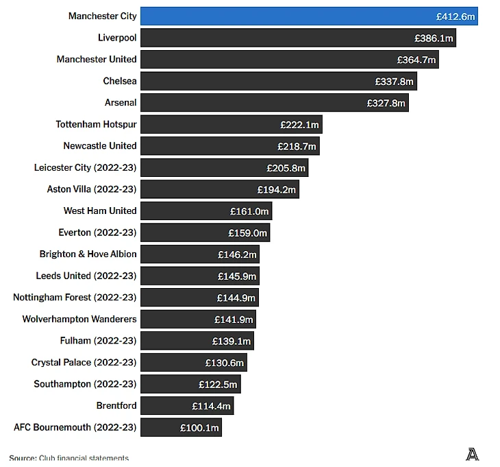 Гистограмма последних зарплатных счетов клубов Премьер-лиги, где «Манчестер Сити» возглавляет список как единственный клуб с суммой более £400 млн.