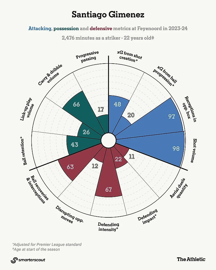 Хименес — это определение финишера. Несмотря на то, что он способен опускаться и выступать в роли связующего игрока для тех, кто играет выше (в 2023/24 годах он отдал восемь передач), инструкции от его менеджера были четкими — входи в штрафную и бей. Он закончил кампанию с 26 голами в 41 матчах.
