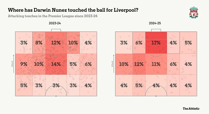 У обоих игроков увеличился процент касаний в центральных зонах в штрафной, что, по логике, должно привести к увеличению результативности. Однако они оба в среднем совершают меньше касаний мяча за 90 минут, и это касается и штрафной. У Нуньеса этот показатель снизился с 8,4 касаний мяча в штрафной до 5,6, а у Жоты чуть меньше — с 8,4 до 7,8.