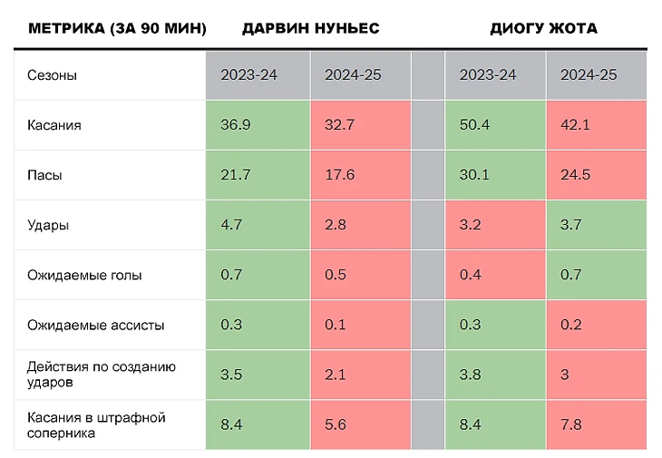 Однако в последнее время «проверка зрения» не соответствует этой оценке. Действительно, по сравнению с сезоном 2023/24 атакующие показатели Нуньеса и Жоты снизились.