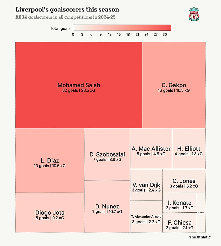 Слот построил команду так, чтобы максимизировать отдачу Салаха, и его показатели говорят сами за себя — 32 гола и 22 результативные передачи в 45 матчах во всех соревнованиях.