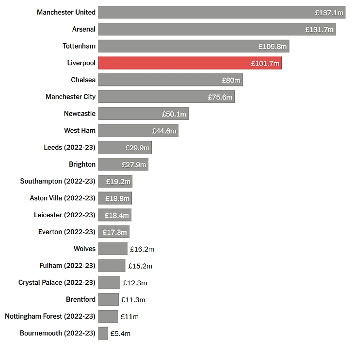 Как видно из приведенного ниже графика, «Ливерпуль» находится далеко от двух лидеров, но их ожидает повышение доходов, когда в начале следующего года будет опубликована следующая отчетность, после возвращения футбольной Лиги чемпионов, а также проведения полного сезона домашних матчей на расширенном «Энфилде».