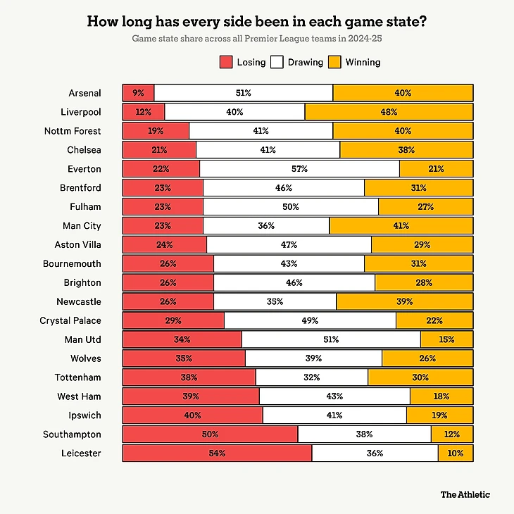 Неудивительно, что ни одна команда не провела в состоянии ведения в счете в матче больше времени, чем «Ливерпуль» — 48%. Только у «Арсенала» доля проигрывания в матче была меньше, чем у «Ливерпуля» — 12%. В тех редких случаях, когда «Ливерпуль» отставал в счете, он быстро исправлял ситуацию.