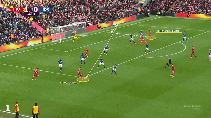 В этом примере из матча с «Ипсвичем» (4:1) Гакпо выполняет навесную передачу на стоящего у дальней штанги Салаха. Тем временем Собослаи пытается атаковать пространство между левым центральным защитником и вингбэком «Ипсвича», что привлекает их внимание и освобождает Салаха. Салах принимает передачу Гакпо правой ногой и вколачивает мяч в сетку левой.