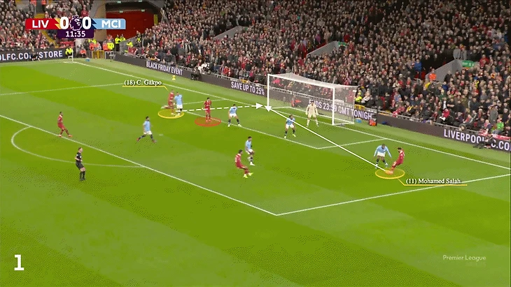 Салах пробрасывает мяч между Мануэлем Аканджи и Натаном Аке, чтобы найти набегающего Гакпо, а Диас, расположившийся между Кайлом Уокером и Рубеном Диашем, на мгновение привлекает внимание правого защитника «Сити», и у левого вингера «Ливерпуля» остается достаточно времени, чтобы получить преимущество и забить гол простым ударом.