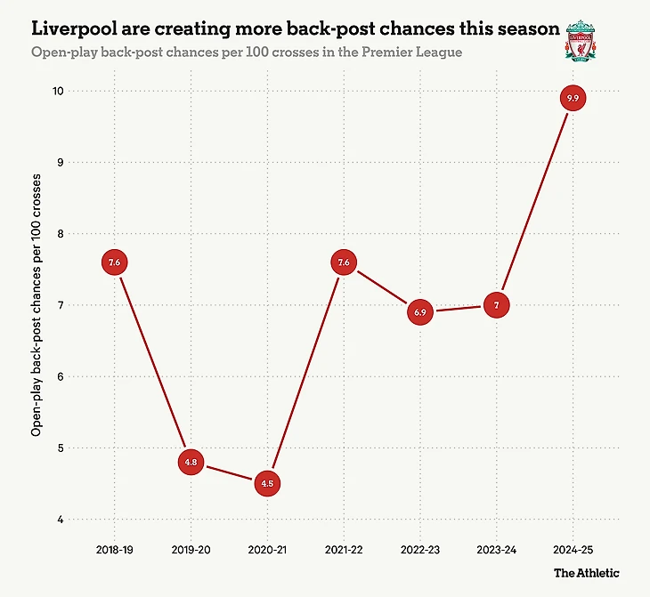В результате «Ливерпуль» стал создавать больше моментов у дальней штанги с кроссов с игры, несмотря на снижение количества кроссов за игру. В этом сезоне команда Слота создала 9,9 моментов у дальней штанги на 100 передач в Премьер-лиге — это самый высокий показатель для «Ливерпуля» с 2018/19 годов.
