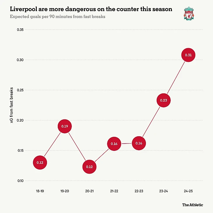 Слоту удалось сделать игры «Ливерпуля» менее переходными, а количество их контратак в свою очередь сократилось примерно на три за игру. При этом они создают больше из меньшего — показатель ожидаемых голов в быстрых контратаках подскочил до 0,31 за игру, что является самым высоким показателем с 2018/19 годов.