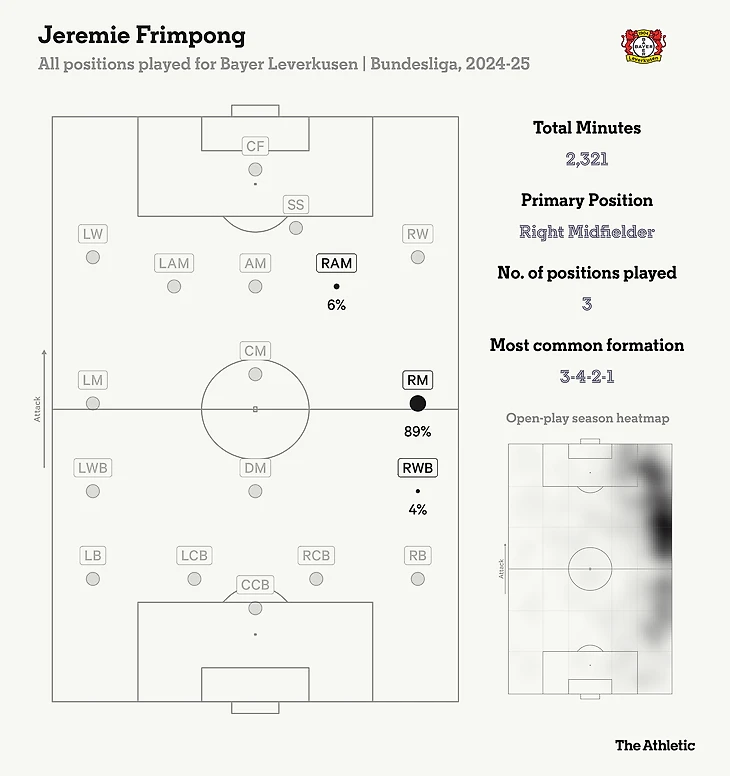 Фримпонг — это живая сила. Все, что он делает, он делает со скоростью и убежденностью, благодаря которым защитникам очень сложно с ним справиться, особенно один в один. Но он не просто атлет. За годы, проведенные в «Леверкузене», он поработал над тем, как правильно выбрать время и где находиться в тот или иной момент атаки. Он так часто оказывается в нужном месте в нужное время.