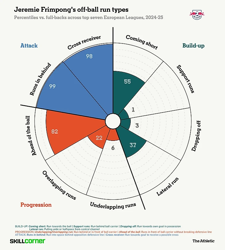 Благодаря его навыкам от него не требуется столь активного участия в построении комбинаций. Это хорошо видно, если посмотреть, как он бежит без мяча, когда его команда владеет мячом. Как видно из профиля SkillCorner, его забегания больше направлены на вертикализацию и растягивание соперника с помощью большого количества забеганий вперед или в штрафную.