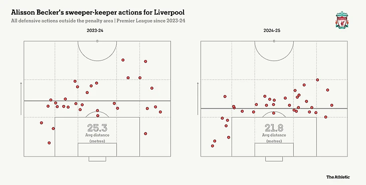 «У них гораздо меньше хаотичных ситуаций, с которыми приходится справляться. Неудивительно, что среднее расстояние до ворот при оборонительных действиях Алиссона и Келлехера в этом сезоне снизилось. «Ливерпуль» чаще обороняется от средней линии, что позволяет голкиперам быть ближе к воротам и сосредоточиться на командовании».