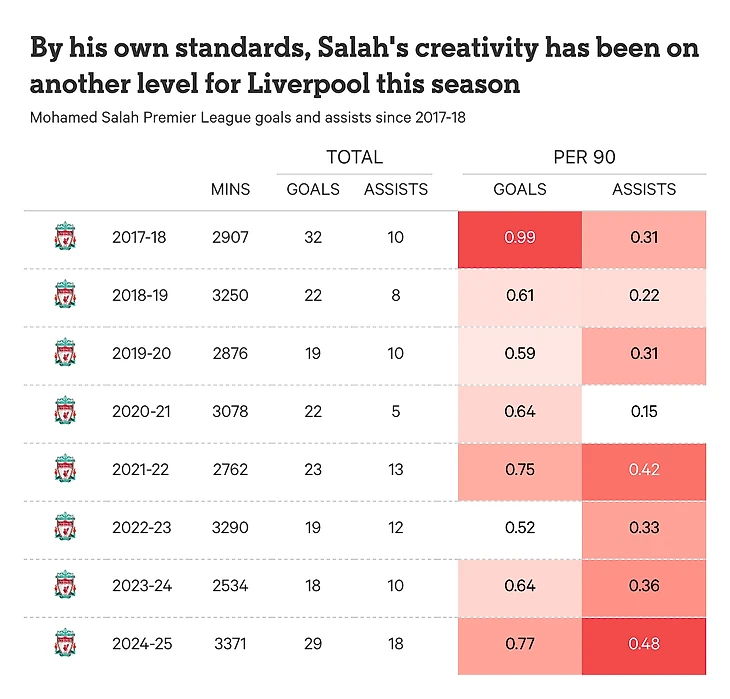 Слот построил свою атаку вокруг Салаха, сократив его работу в обороне, чтобы получить преимущества в атаке. Это принесло свои плоды: египтянин стал рекордсменом по количеству голов и передач в сезоне Премьер-лиги (47; 29 голов и 18 передач) за весь сезон, причем добился этого в 38 матчах, а не в 42, как Энди Коул и Алан Ширер.