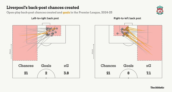 В этом сезоне ни одна команда Премьер-лиги не создавала больше моментов на дальней штанге, чем «Ливерпуль» — в общей сложности 11 ожидаемых голов.
