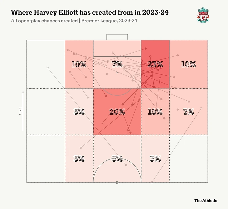 Недостаток игрового времени у Эллиотта в прошлом сезоне означает небольшой объем выборки данных, но он был гораздо активнее задействован в сезоне 2023/24, заработав звание «суперзапасного» в первой половине этой кампании, а затем сыграв ключевую роль во время кризиса с травмами в «Ливерпуле» в первые месяцы нового года.