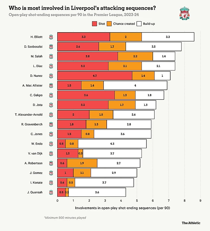 Если посмотреть на результативные действия «Ливерпуля» с игры в сезоне 2023/24, то он был лучшим среди всех игроков «Ливерпуля» за 90 минут. Возможно, он и не тот игрок, который наносит удар или отдает завершающий пас, но на рисунке ниже показано, что он часто участвует в подготовке атаки, будь то на заключительном этапе или в конце комбинации.
