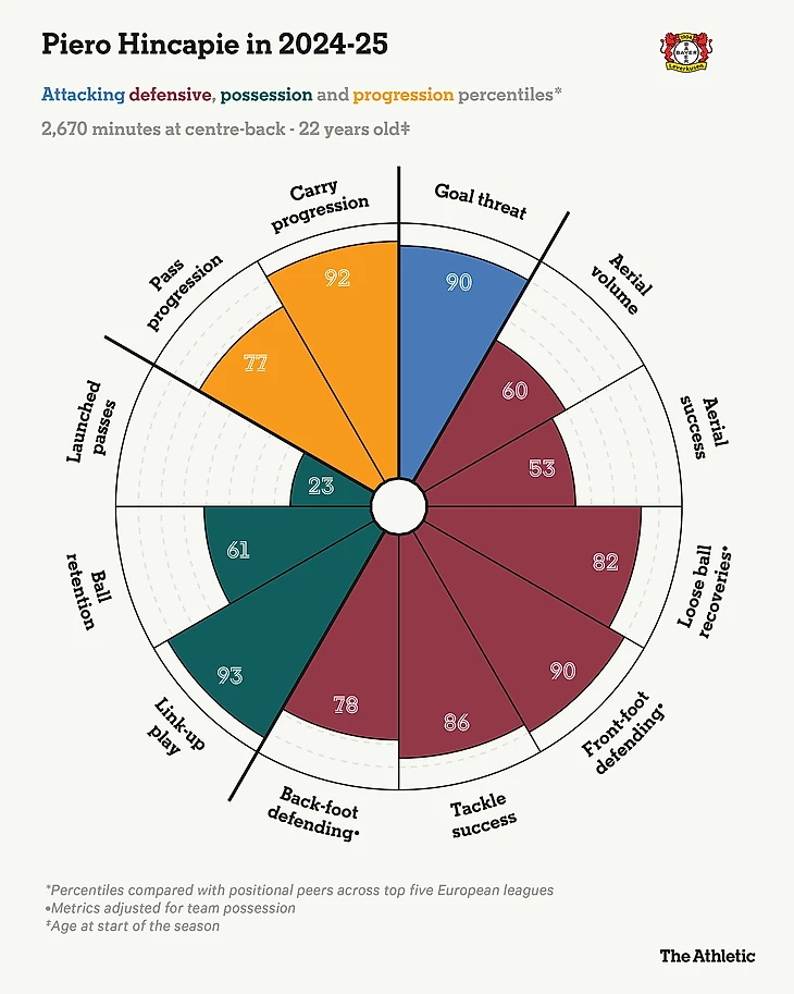 Первый — это Пьеро Инкапиэ, который с тех пор, как в 19 лет приехал в Германию, обеспечивал надежную защиту «Байера» из Леверкузена. Как показано на рисунке ниже, Инкапиэ ищет работу в обороне, с готовностью принимает вызовы (защита в высокой линии, 90 из 99) и часто выходит победителем, когда ему это удается (успешность единоборств, 86 из 99).