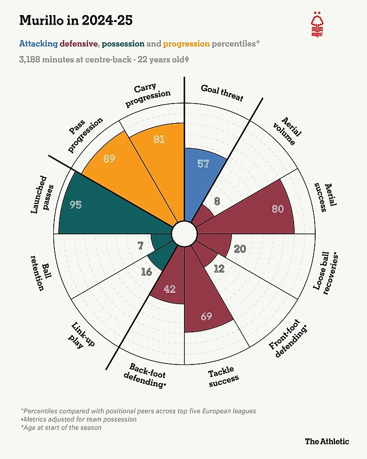 Хотя Мурилло из «Ноттингем Форест» — игрок другого профиля, у него есть сходство с Геи в его нынешних тактических требованиях, и он еще один игрок, который нравится «Ливерпулю». Используя систему с низким блоком, которая фокусируется на переходной игре в атаке, Мурилло часто стремится разыгрывать прямые мячи вперед, когда у него есть такая возможность (результативные передачи — 95 из 99).