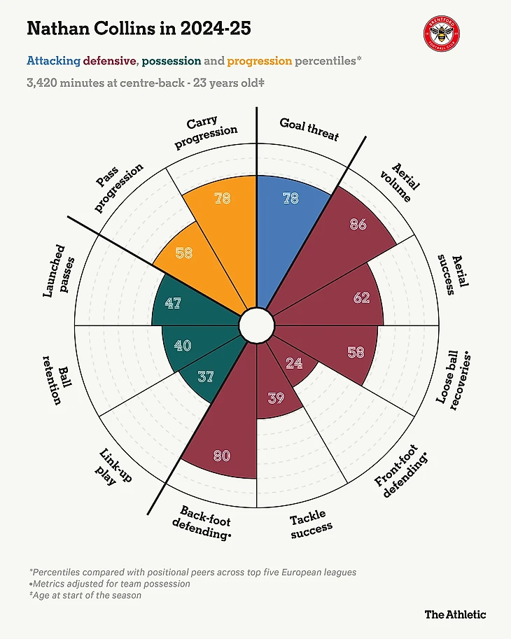Коллинз обладал природной уверенностью во владении мячом с того момента, как он перешел в Премьер-лигу, подписав контракт с «Бернли» в 2021 году. «Брентфорд» — не та команда, которая умеет играть с мячом, но ему комфортно выходить на поле (прогрессия проходов с мячом — 78 из 99).