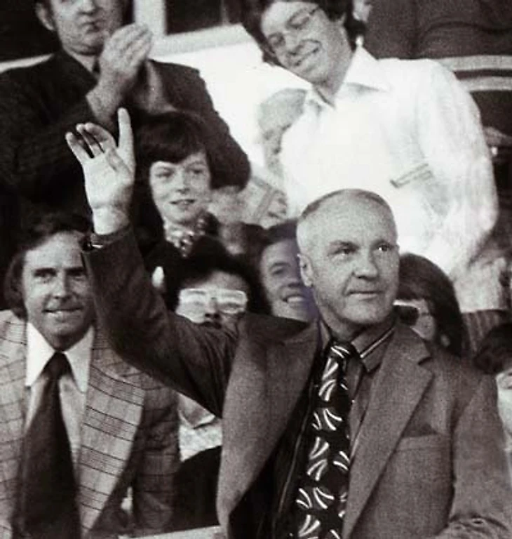 Билл Шенкли провел свой первый субботний день на пенсии, наблюдая за домашним матчем «Эвертон» – «Дерби Каунти», который состоялся 18 августа 1974 года, и, как видно на фотографии, поблагодарил «Гудисон» за бурные аплодисменты. «Ливерпуль» играл в «Лутоне», где Боб Пейсли показал, что он умеет подбирать цитаты. На вопрос, чем занимается Шенкли, он ответил: «Он пытается отойти от футбола. Я думаю, он пошел посмотреть на «Эвертон»».