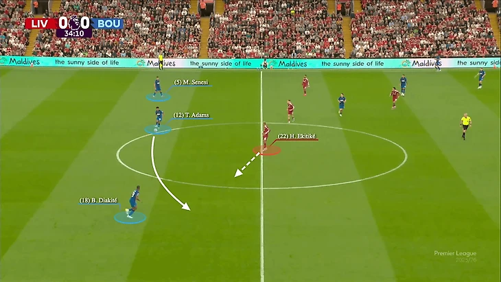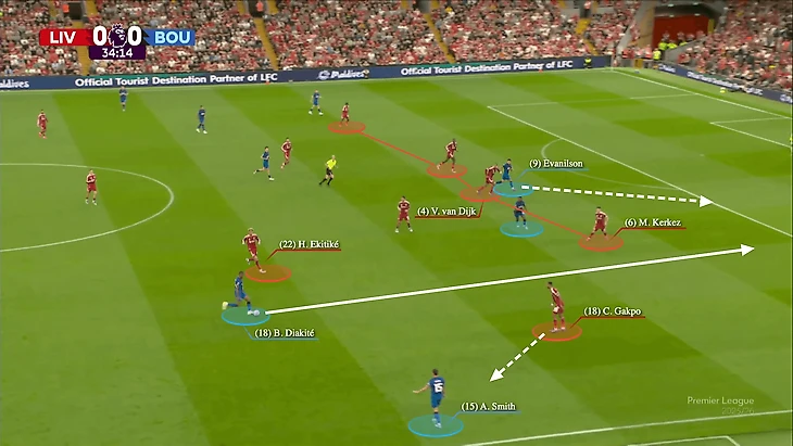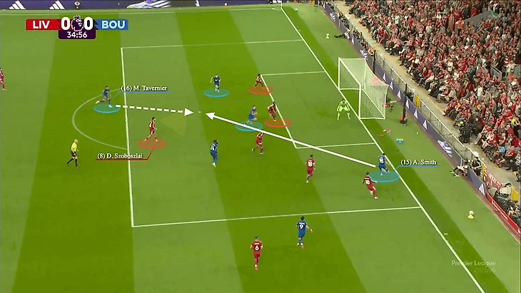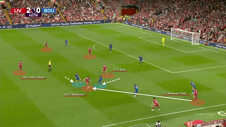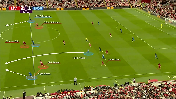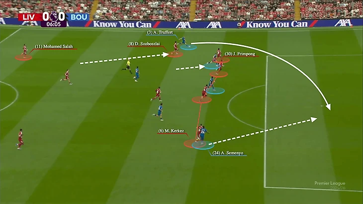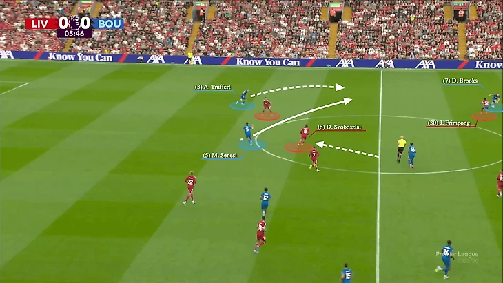 «Борнмут» запускает контрпрессинг на Собослаи, пытаясь прервать передачу Салаха на Флориана Вирца. Будучи два против одного Собослаи, Скотт блокирует передачу, и Адамс уходит с мячом.