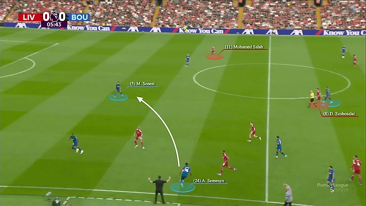 Пинбол в центре поля начинается с длинного паса Джордже Петровича на правого вингера Антуана Семеньо, который был основным игроком без мяча «Борнмута», когда «Ливерпуль» атаковал высоко, целясь в зону Керкеза по воздуху.