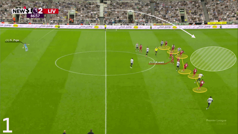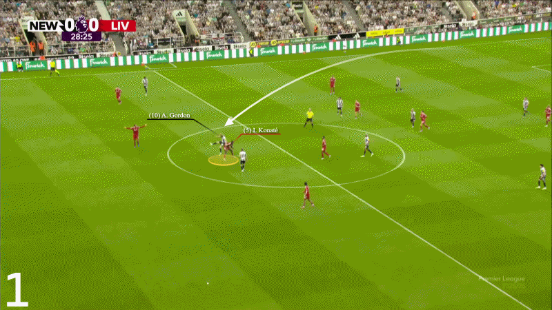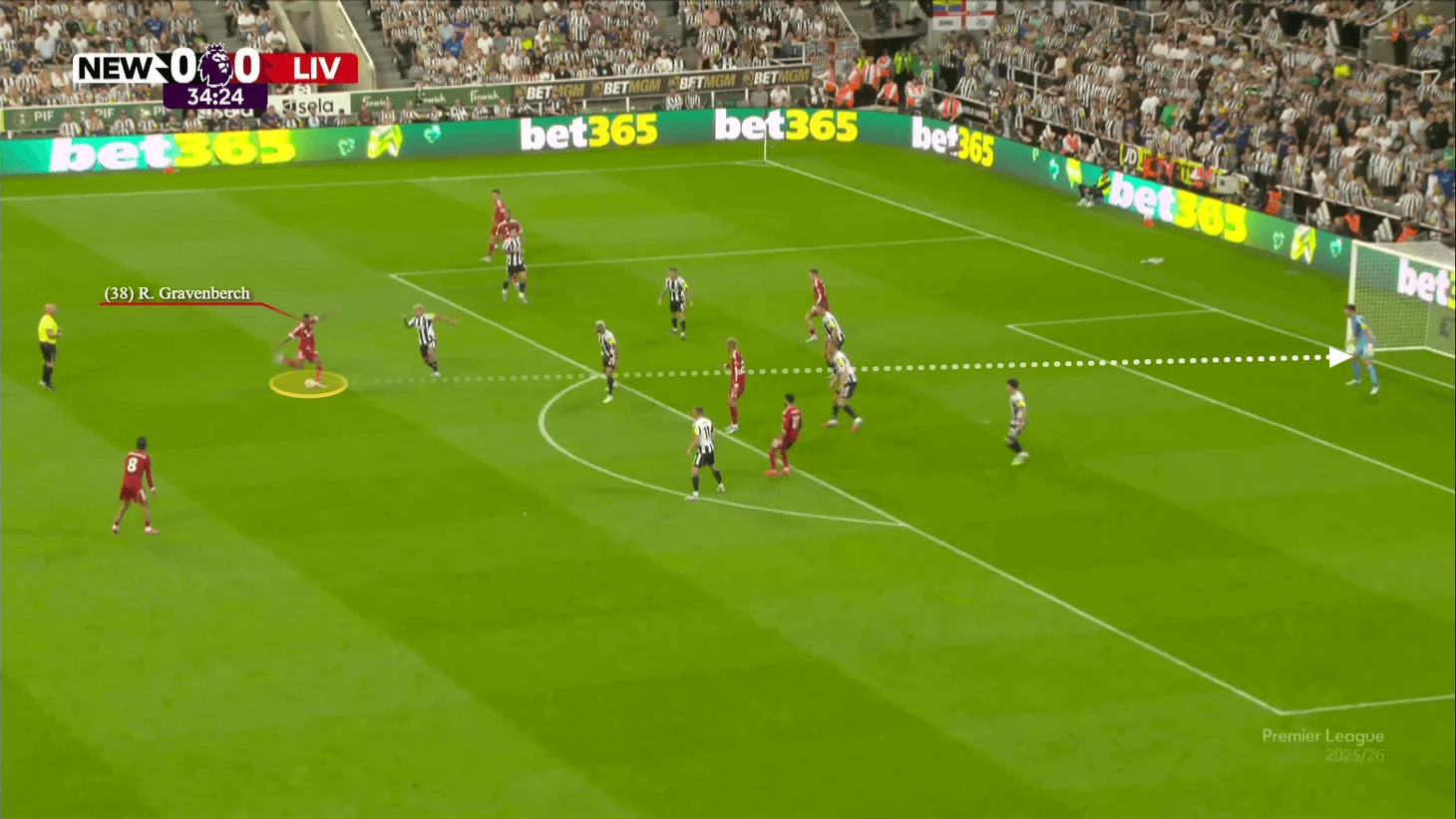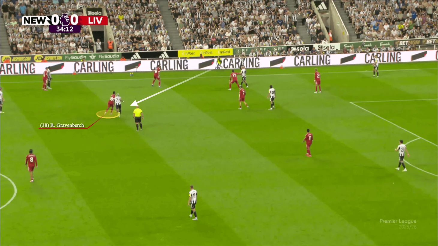 Энтони Гордон также слишком легко обыграл его в воздухе, что привело к возникновению момента, когда запасному правому защитнику Доминику Собослаи пришлось предпринять последний отчаянный шаг, чтобы предотвратить гол.