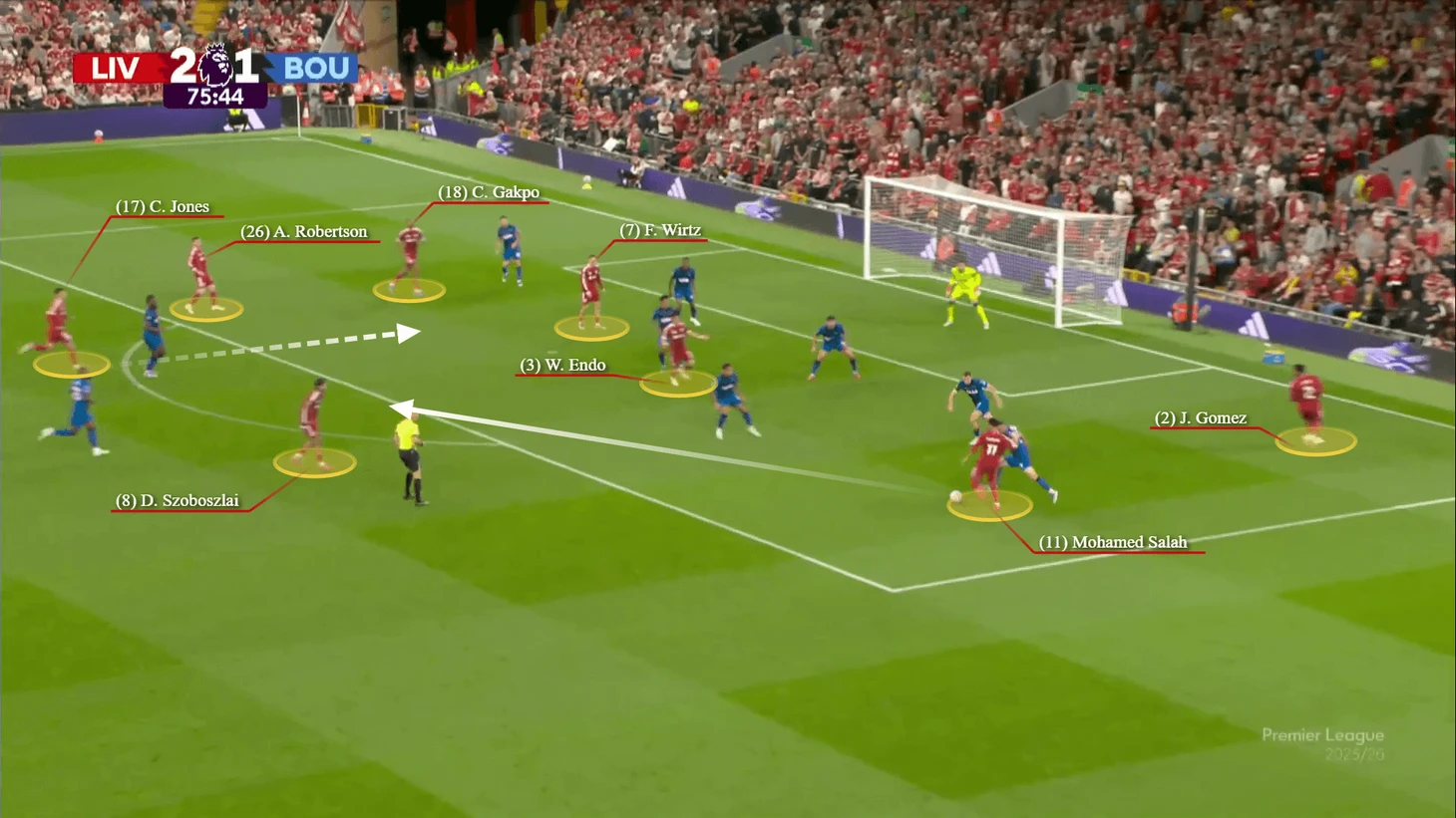 Неудивительно, что, учитывая изменения в атакующей линии «Ливерпуля», они уже не ощущают себя такой мощной силой, как в прошлом сезоне под руководством Слота и до этого, когда их возглавлял Юрген Клопп. Хорошо отлаженная прессинговая машина во главе с Собослаи и Луисом Диасом была заменена Вирцем и Уго Экитике, которые все еще пытаются наладить взаимопонимание с мячом и вне его.