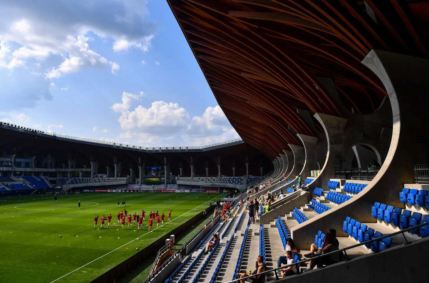 У стадиона «Пушкаш Арена» в Будапеште толпа разделена двумя разными цветами.