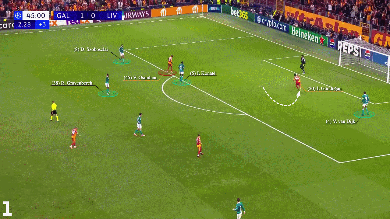 «Галатасарай» использовал другую стратегию. Они вынуждали пасовать на Гравенберха, одновременно исключая другие короткие варианты, чтобы затем наброситься на него и отобрать мяч. В приведенном ниже примере Илкай Гюндоган отклоняется в сторону, чтобы помешать Алиссону Беккеру отдать пас Ван Дейку, в то время как присутствие Виктора Осимхена мешает вратарю отдать пас на Конате или Собослаи. Гравенберх, казалось бы, открыт, но Лукас Торрейра прыгает на него, как только приходит пас, и выигрывает владение мячом, переправляя его Осимхену.