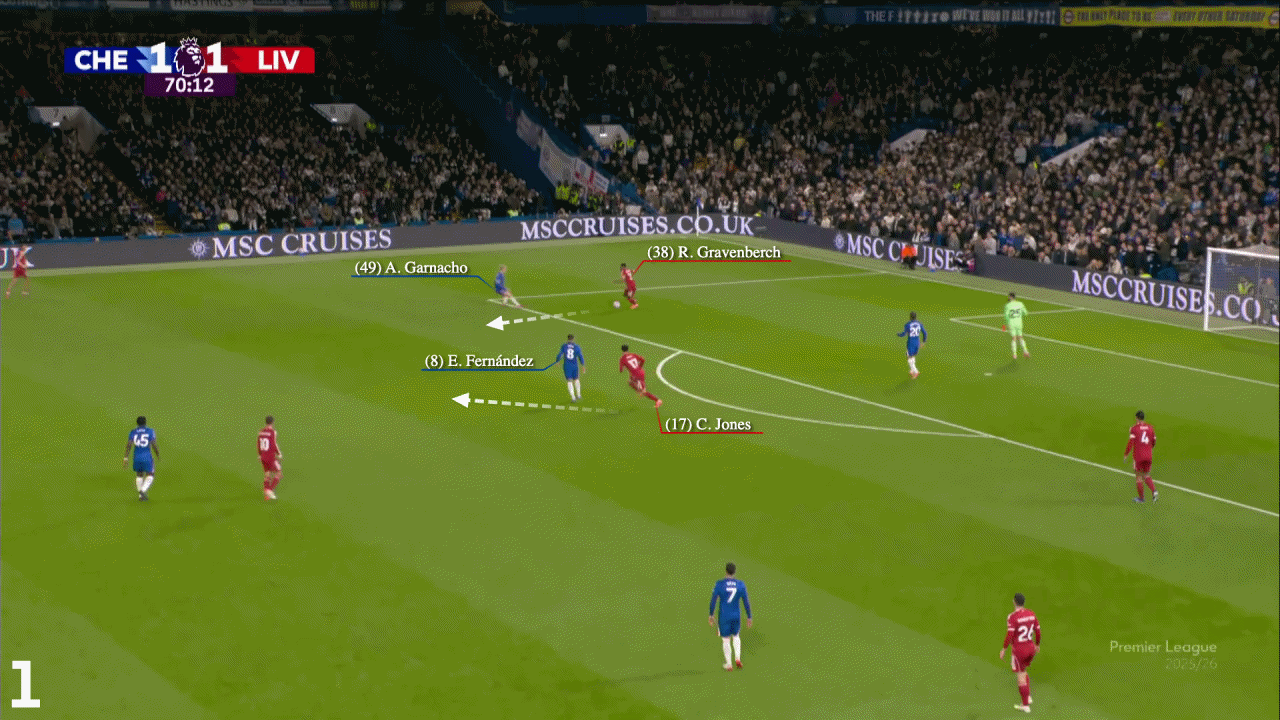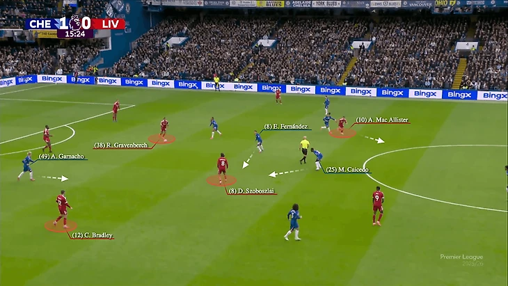 «Челси» использовал стратегию персональной опеки: Энцо Фернандес и Мало Гюсто следили за Гравенберхом и Алексисом Мак Аллистером соответственно, отрезая легкие передачи в центр поля. Когда игрок сборной Нидерландов все-таки получил мяч от защитника, как показано ниже, он опоздал на секунду, чтобы определить правильный пас, позволив «Челси» свести на нет его ближайшие возможности. Мак Аллистер немного запаздывает, чтобы пробиться в пространство, созданное Собослаи, который тоже опустился, лишая его возможности сыграть.