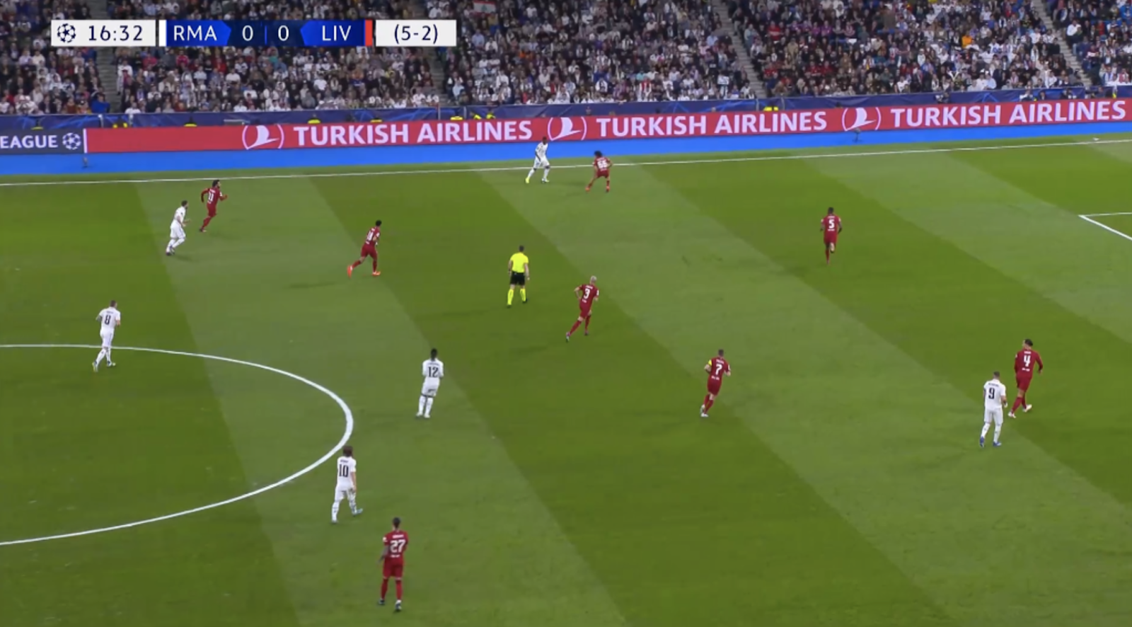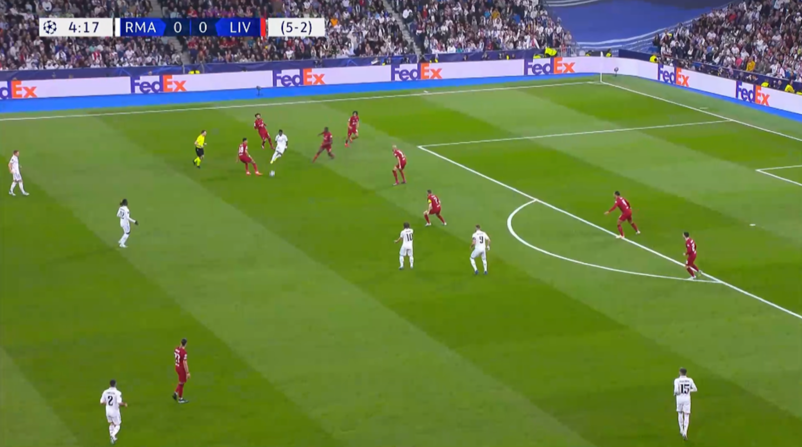 Модрич переводит на левый фланг на Начо, из-за чего Трент должен смещаться на фланг, чтобы оказать давление на запасного защитника «Реала». Испанец пробросил мяч мимо правого защитника «Ливерпуля» и в сторону Винисиуса, но в этот раз ему помешал Ибу Конате.