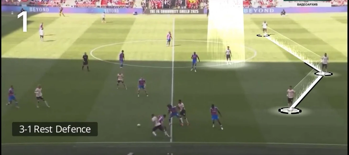Причина – системная структура атакующих построений, а не ошибка одного футболиста. Это не отдельный эпизод – это повторяющаяся структура, при которой в оборонительной линии остается 3 игрока, а над ними – 1 опорник, т.е. образуется своеобразный ромб. Можете вернуться к скриншотам выше и обратить на это дополнительное внимание