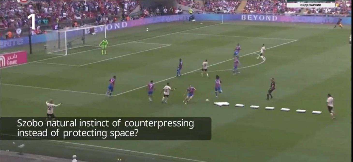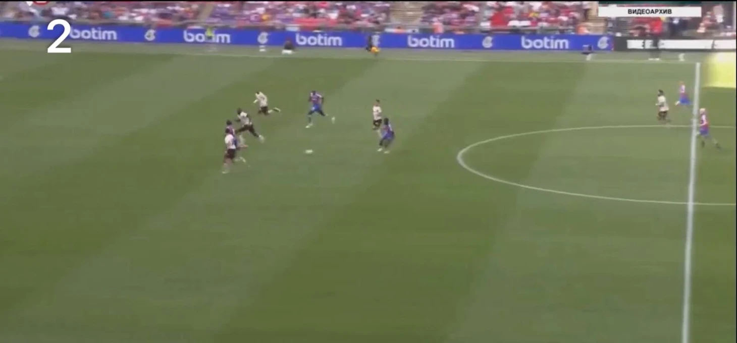 В данном эпизоде виден схожий патерн – потеря мяча из-за небольшой заминки и сразу минус бóльшая часть команды в выигрышной для «Пэлас» ситуации.