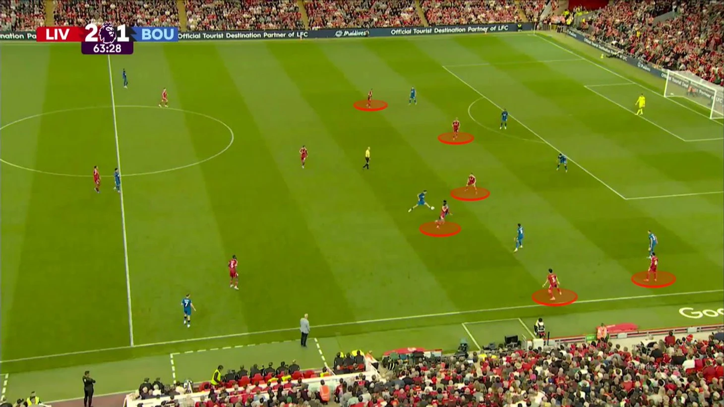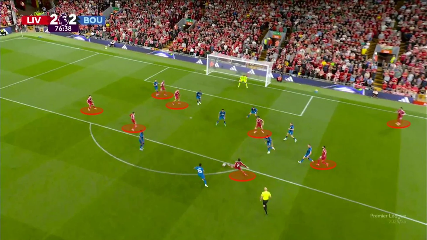 После продвижения мяча почти до штрафной площади картина не сильно изменилась – только игроки заняли более высокие позиции. Однако потеря мяча привела к ситуации, где сразу 5 игроков «Ливерпуля» оказались отрезаны, а Собослай, увидев эту ситуацию, в естественной для себя манере бросился на мяч, в попытке отобрать его в контрпрессинге.