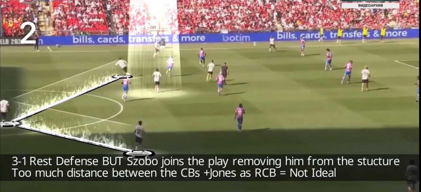 2. Снова ситуация, где у нас 3 игрока в задней линии и 1 игрок в опорной зоне — теперь это сам Собо, Кертис занял роль правого центрального защитника, когда фланговые поднялись выше.