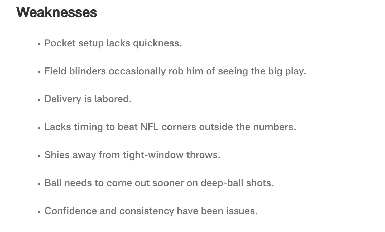 Во-первых, все отмечали его физические недостатки – низкий рост (всего 6 футов и 1 дюйм – очень мало для квотербеков – в истории НФЛ только Дрю Бриз и Рассел Уилсон добивались успеха с таким ростом), низкий атлетизм (несмотря на весьма неплохо накаченные ноги), и очень короткие руки – самые короткие за 25 лет измерений среди всех кто выходил на драфт. С такими руками отдавать дальние и сильные передачи считалось абсолютно невозможным чисто физически.