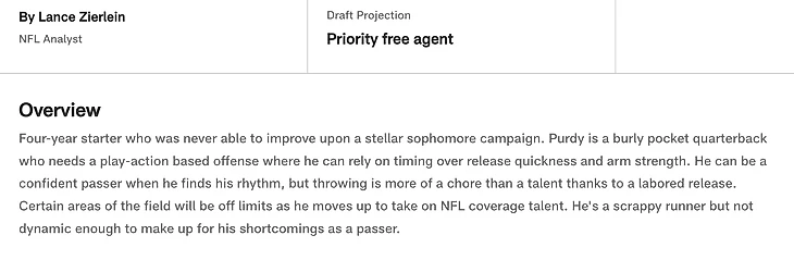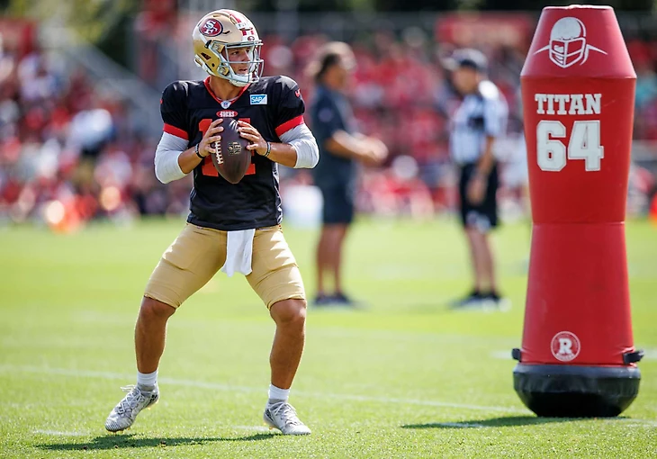 Собственно, и я как болельщик СФ по итогам того драфта был абсолютно убежден что данное забавное видео — это последнее, что я услышу в жизни о Броке Перди. Тем более он стал аж 4-м квотербеком в ростере команды, тогда как в сезон СФ всегда брало только двоих. Причем с первым номером все было абсолютно очевидно – это была большая надежда команды Трей Ланс – за которого отдали невероятную цену – три пика первого раунда и еще и второй. Но плюс еще был многолетний лидер СФ Джимми Гаропполо, который имел хорошие в целом результаты и выход в СБ и финал конференции 2021 года. Его вроде хотели куда-то пристроить где он мог бы быть стартером, но он что-то после травмы не особо был кому-то нужен. Был еще надежный ветеоран Судфилд, с которым был уже подписанный гарантированный контракт на 2 млн долларов и в случае его отчисления команда теряла и деньги, и место под потолком зарплат. И потом уже Мистер Ненужный, который в такой ситуации казался ненужным просто абсолютно.