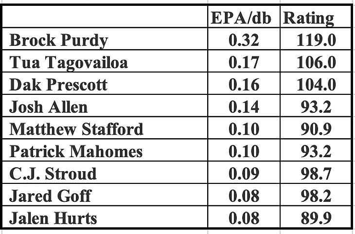Правда в том великом сезоне у Патрика был потрясающий EPA на дропбек равный 0.33 очка (по сути, каждые его три передачи приносили команде гарантированное очко). Но и у Брока тоже было 0.32. Эти показатели тоже находятся на уровне топовых Пейтона, Тома и Аарона.