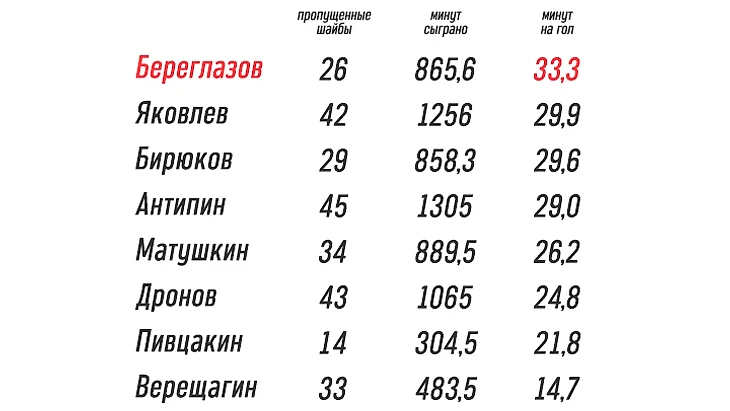 Из основных защитников в регулярном чемпионате именно при Береглазове команда пропускала реже всего. В таблице также учтены шайбы, пропущенные в меньшинстве.