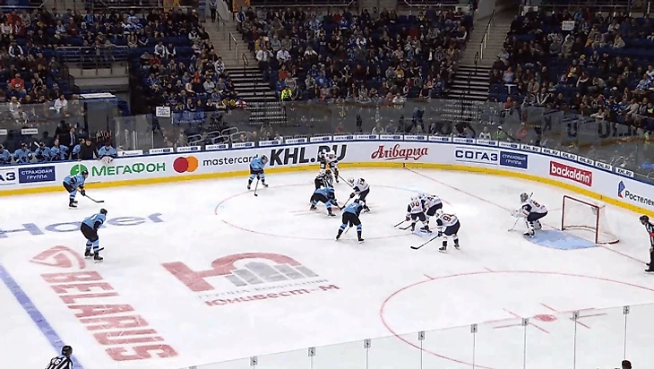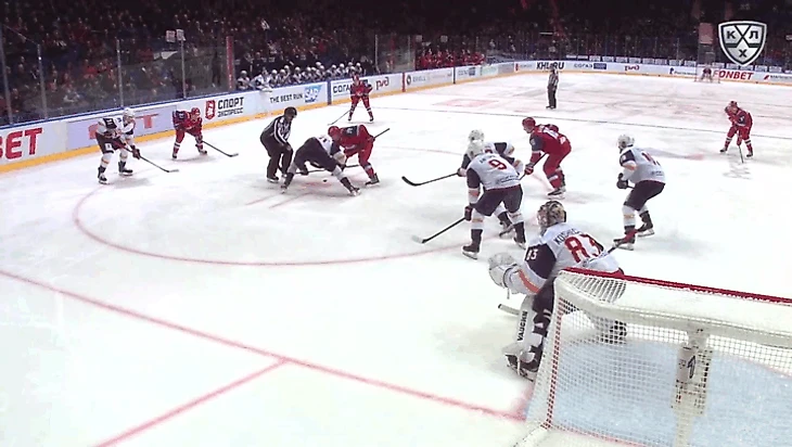 Проигранное вбрасывание, Береглазов прерывает пас на пятак, но от него шайба попадает к открытому сопернику.