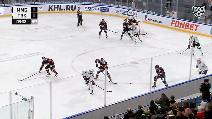 Позиционная атака Трактора со сменой мест, защитник челябинцев, оставленный без внимания, катит к пятаку, где пара обороны Магнитки толкается с форвардами Трактора.