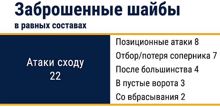 Такой стиль максимально открывает площадку для атак сходу. «Металлург» забросил 46 шайб в равных составах, только 8 из них пришли в результате хоть сколько-нибудь долгой позиционной атаки и еще 4 – сразу после окончания большинства. Основная часть – стремительные выпады со своей половины, одна-две передачи и решающий бросок, иногда с добиванием.
