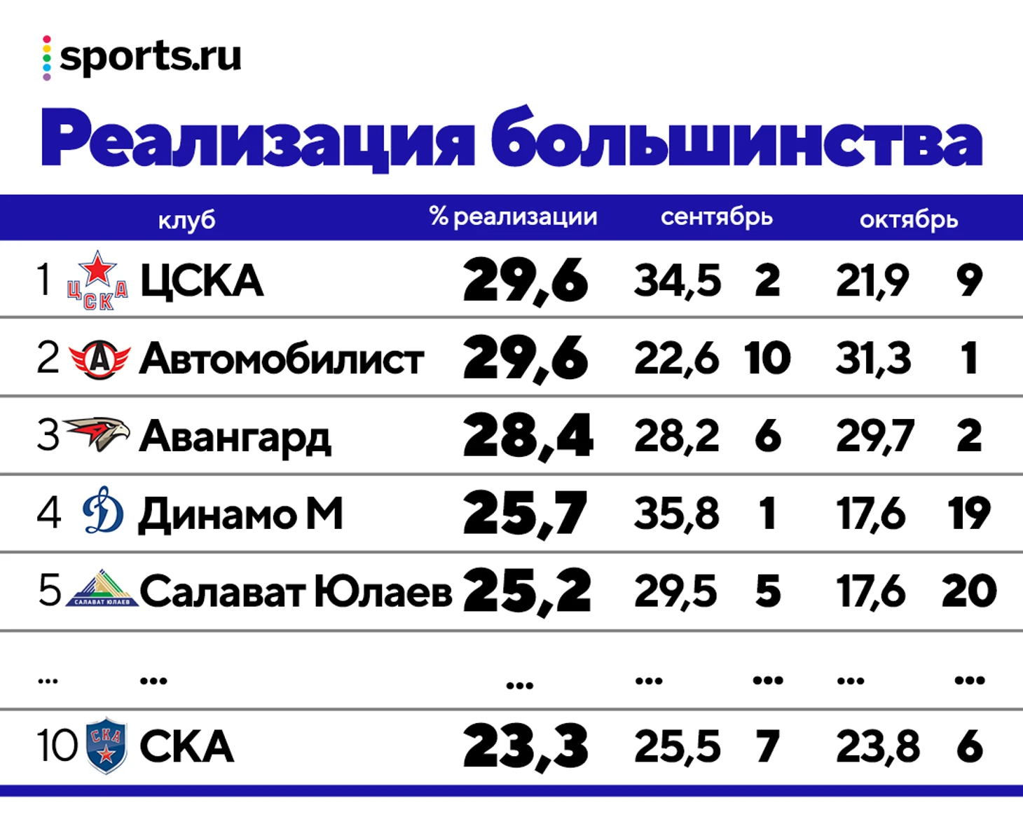 Несмотря на весь хаос, по реализации армейцы держатся сразу за группой лидеров. Особенно ценно, что результат относительно стабилен, примерно каждое четвертое удаление приводит к голу – это хороший показатель. Лидеры после очень удачного старта немного сдали: у «Металлурга», «Салавата Юлаева», «Динамо» и «Витязя» в октябре случился провал, только «Автомобилист» разогнался в октябре. СКА сильно не впечатляет, но играет ровнее.