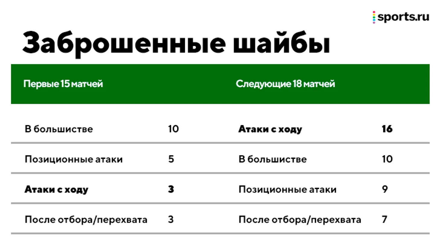 Нападение оживилось, количество заброшенных шайб в целом увеличилось, но главный рывок обеспечили именно атаки с ходу, которые стали проходить в больших объемах – следствие изменения стиля. Выходы с численным преимуществом на чужие ворота начали возникать чаще.