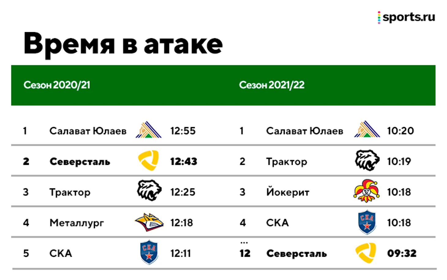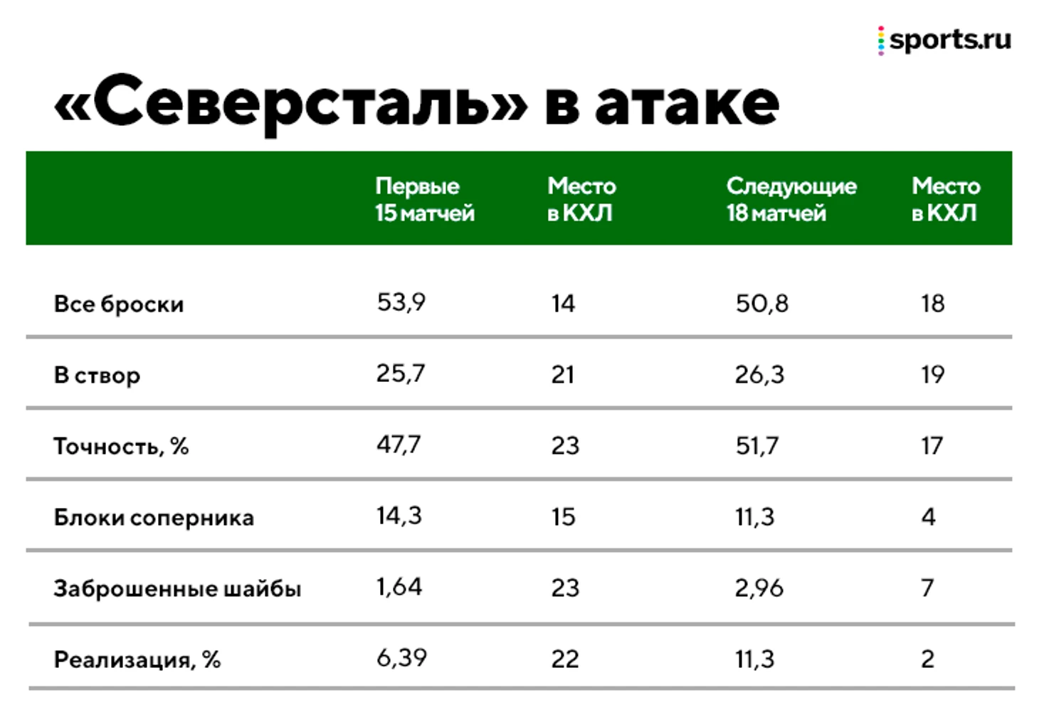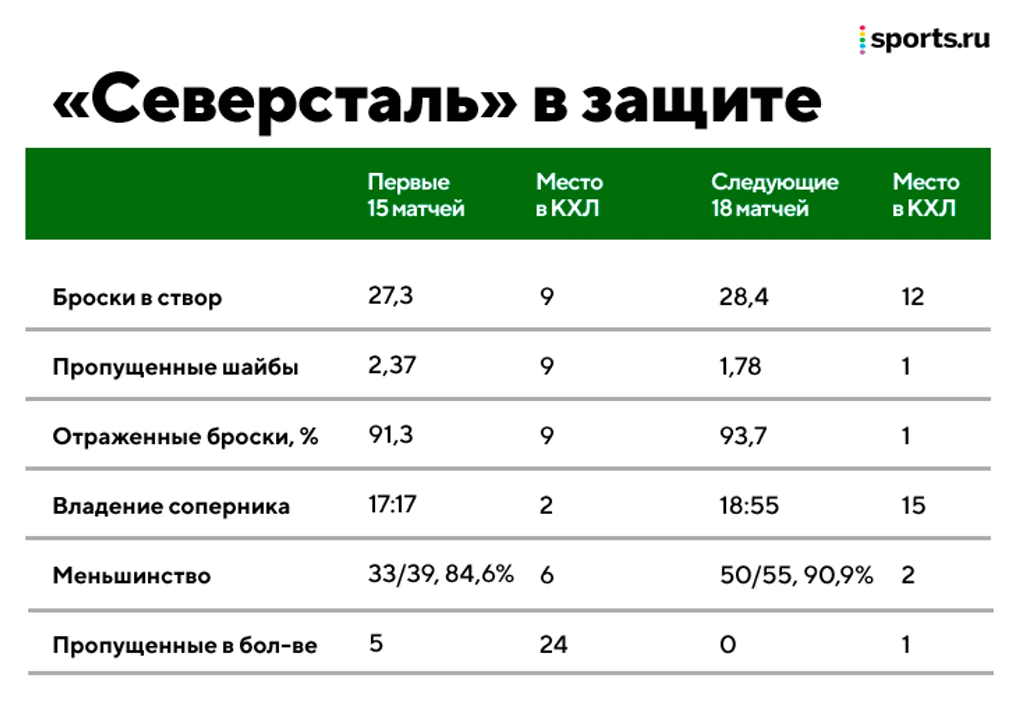 Больше месяца с начала нынешней регулярки «Северсталь» также шла на втором месте за «Салаватом Юлаевым» – как и годом ранее. Но из-за неудачных результатов игру пришлось подкорректировать, о чем сказал Андрей Разин в интервью во время ноябрьской паузы: «То, что мы показываем в последних 10-12 матчах, — мы немного, чуть-чуть изменили тактику. Хотя, может, это незаметно простым болельщикам».
