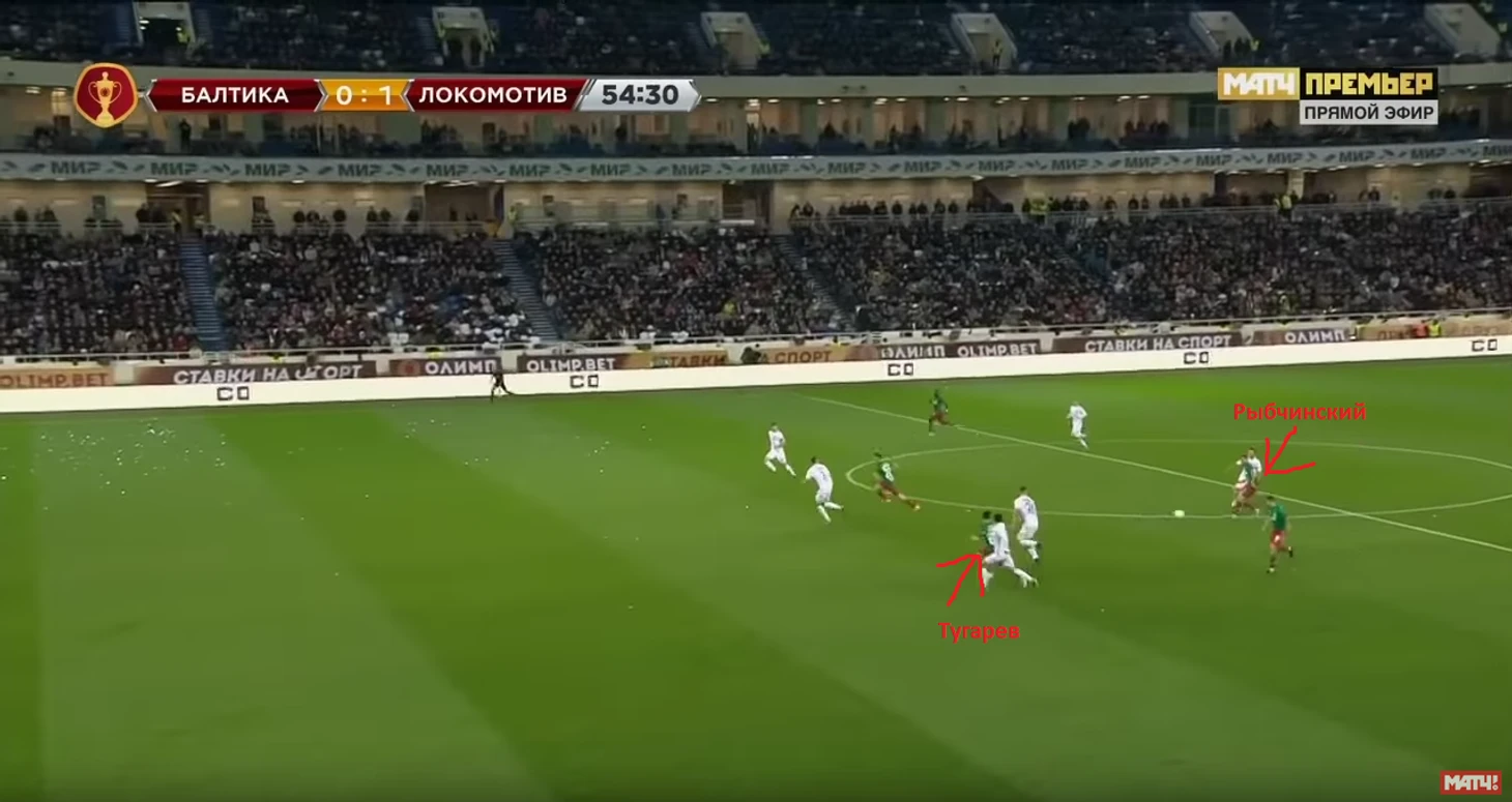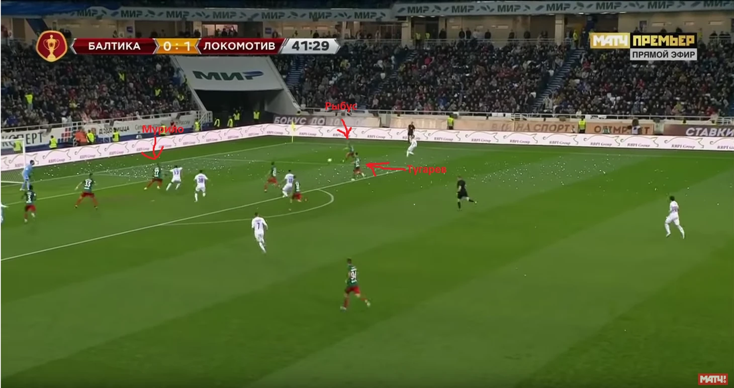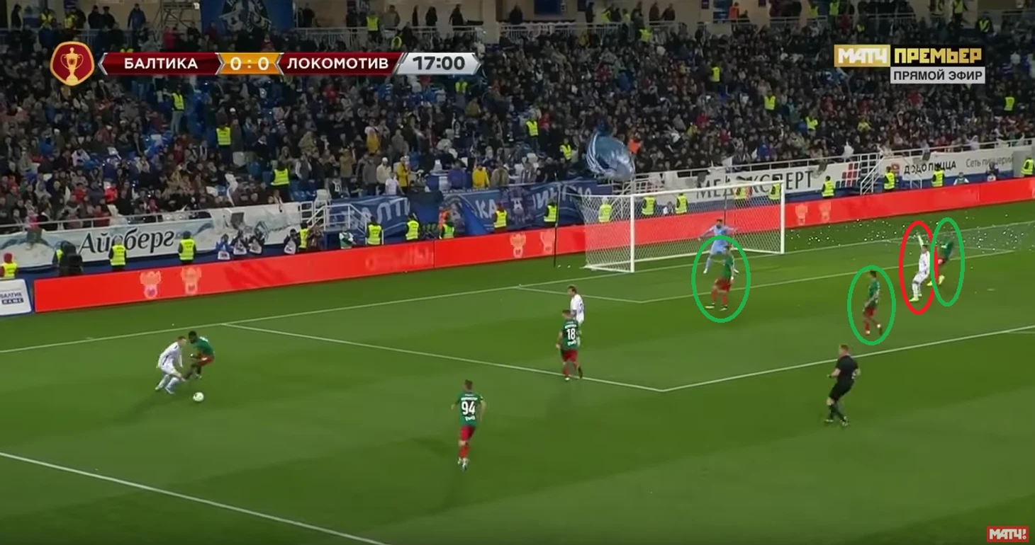На 64 минуте еще один момент пришел с левого фланга "Локомотива". Тугарев остался один против двух игроков "Балтики", в результате чего калининградцы смогли довольно просто проникнуть в штрафную(см. следующее изображение).