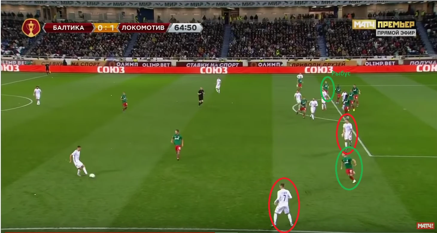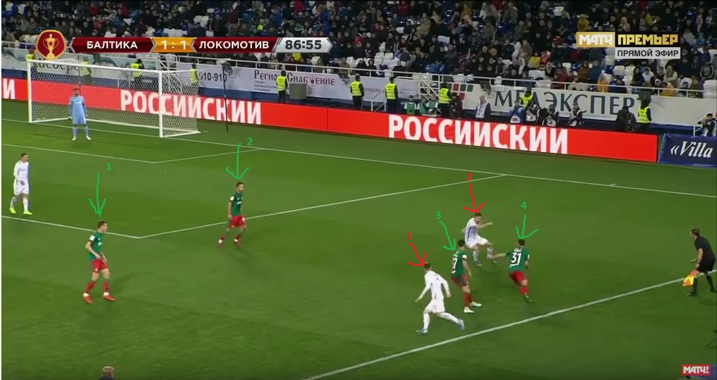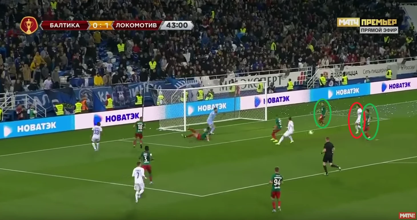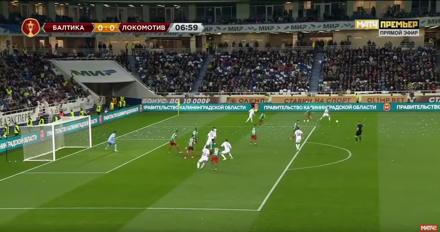 На 87 минуте "Балтика" могла все заканчивать, но забила гол из офсайда. Несмотря на это, я хочу остановиться на данном моменте, посмотрите, как 2 футболиста "Балтики" обыгрывают четырех обороняющихся "Локомотива" и отдают передачу вдоль ворот, которую никто не прерывает.
