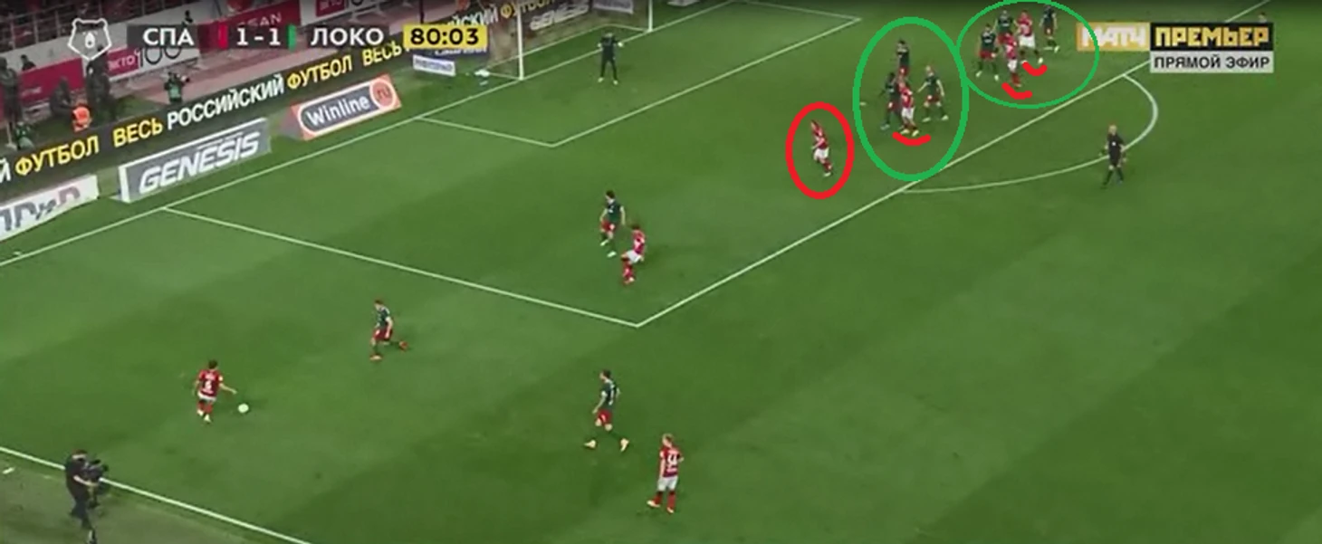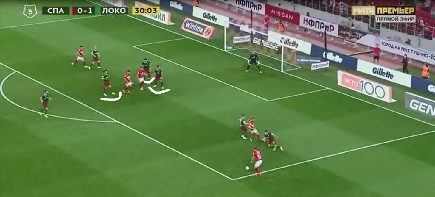 В момент подачи с фланга Крал остается абсолютно один в 5 метровой зоне вокруг себя, тогда как 6 обороняющихся игроков «Локо» занимаются опекой 3 нападающих «Спартака». Идет передача на Крала, то сбрасывает мяч дальше. Крыховяк откровенно проспал момент скидки Крала и упустил Соболева, который спокойно отправил мяч в сетку. 2:1.