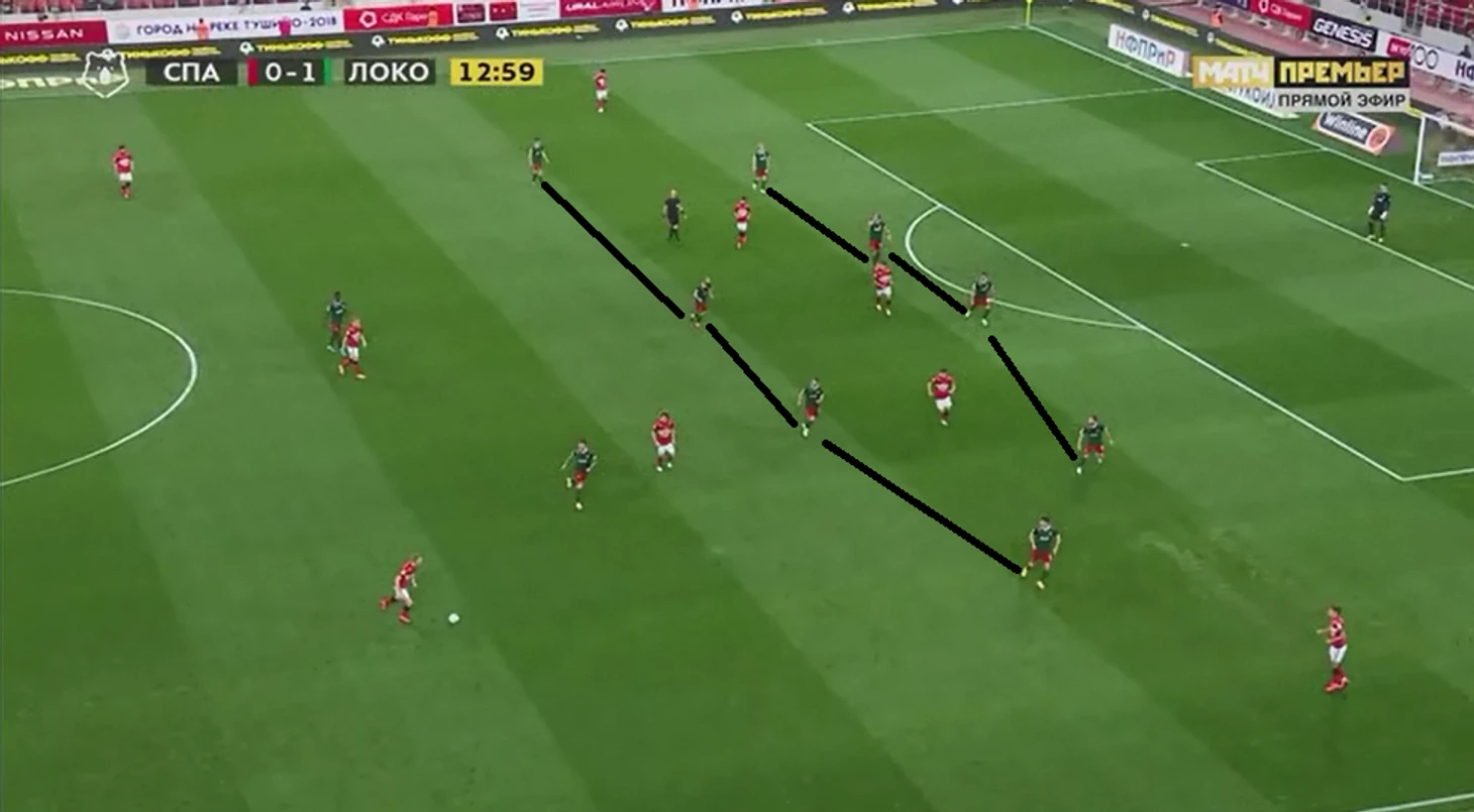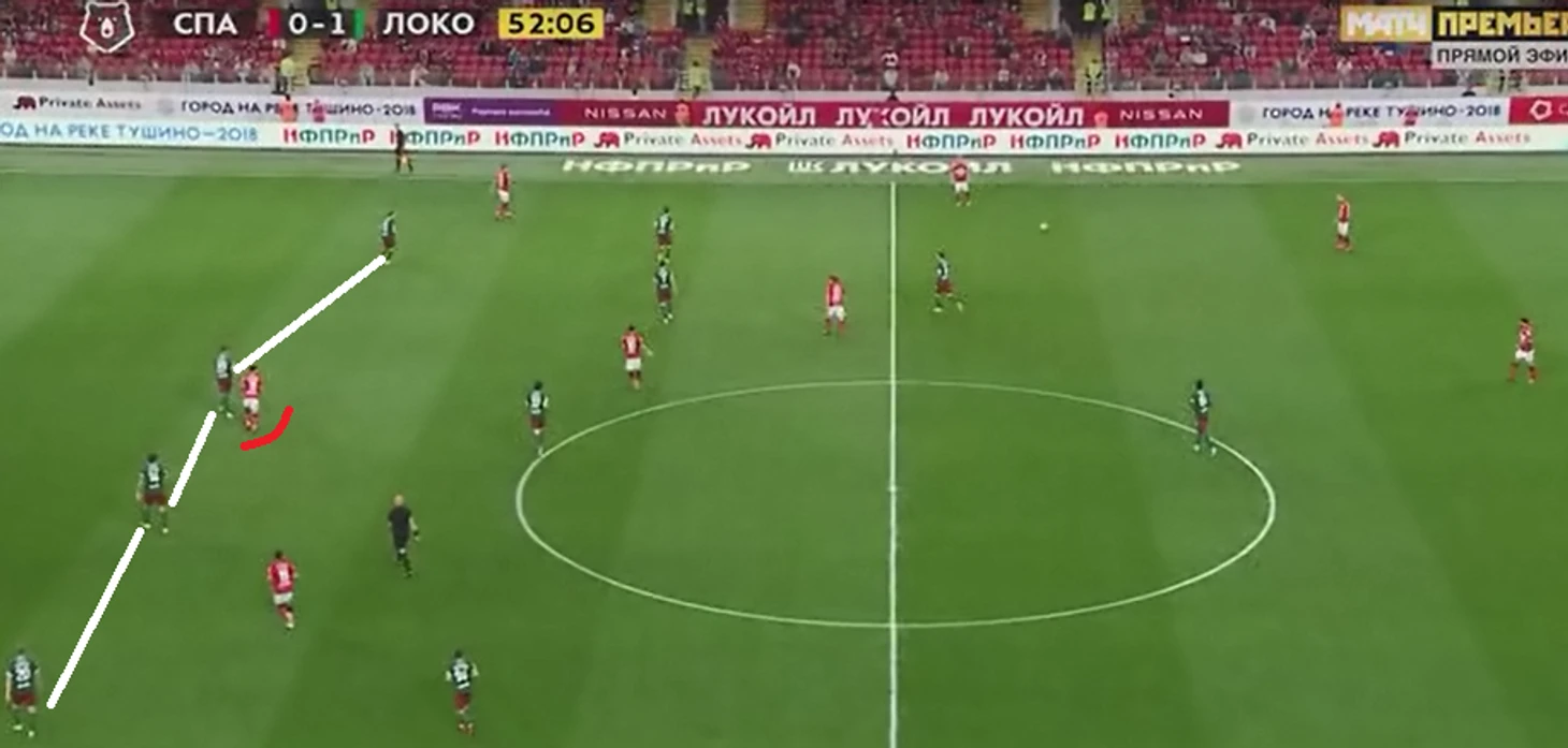 4. «Локо» быстро забил и сел в оборону. «Спартак» не силен в позиционных атаках, и «Локомотив» даже без использования активного прессинга не давал ничего создать сопернику впереди. Это получалось благодаря тому, что «Локо» близко друг к другу располагал линии полузащиты и обороны, не давая пространства атакующим футболистам «красно-белых».
