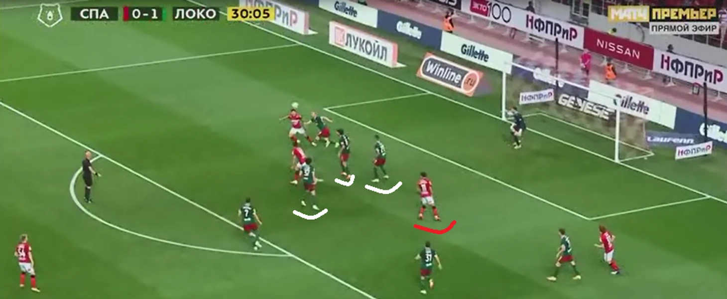 7. На 30 минуте Спартак получил шанс сравнять счет, в этом моменте стоит отметить действие спартаковских нападающих, которые своим движением внутри штрафной запутали защитников Локо. В момент подачи Зобнина в штрафную на Аиртона, Чорлука, Мурило и Магкеев находятся 2 в 3 против Понсэ и Ларссона, но проблема в том, что Мурило и Магкеев смотрят на мяч и не замечают движения Ларссона, который открылся за спиной у бразильца: