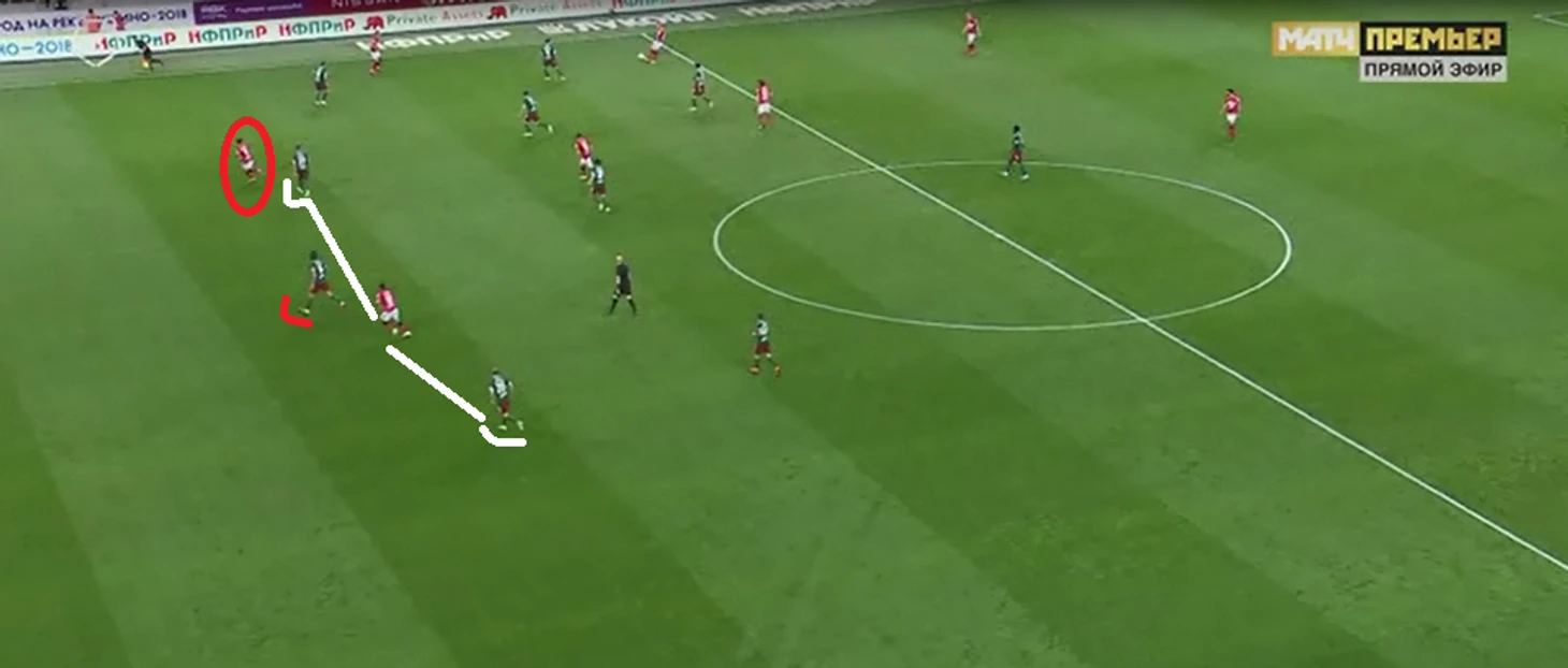 6. Стоит отметить прессинг «Спартака», который плотно запер «Локо» на своей половине поля. Непонятно, почему имея Эдера в составе команда вообще пыталась выходить из-под прессинга через пас, когда можно было играть вперед на португальца и задействовать его сильные стороны(умение побороться и зацепиться за мяч) .